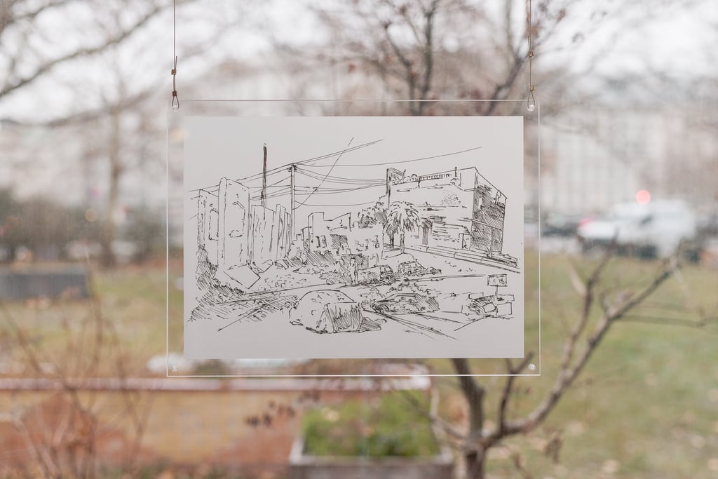 Almukhtar’s early works reflect his need to document the volatile political situation in his home country. Since invading Iraq in 2003, U.S. troops would line the streets – whether overtly or covertly – with the justification of supposedly gaining intelligence on Jihadi terrorist organisations. Almukhtar saw this military presence as an excuse to exhaustively police ordinary Iraqi citizens. His camera was confiscated while attempt- ing to document this once on his way home from art school. He subsequently turned to recording his observations on tracing paper. THE WITNESSING ARCHIVE (2010) comprises drawings of overlapping observations. Some were transcribed directly onto the page if he was able to hide out in a parked car. Others were started on the streets but only completed later in the safety of his home.